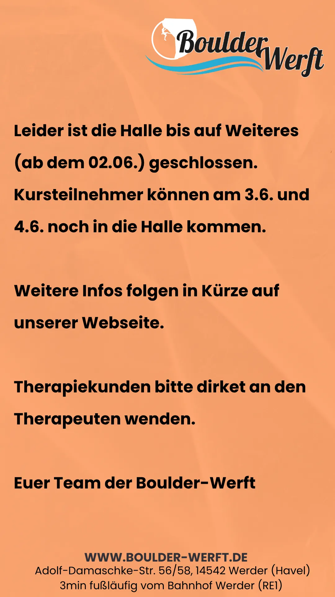 Anmeldungen für die Therapiekurse oder das Therapiebouldern erfolgen über diese Email: therapie(at)boulder-werft.de
